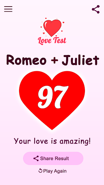 💘 A playful love compatibility app: enter two names to get a love % score, try a love quiz for deeper “chemistry” hints, and share results with friends. Designed for fun/entertainment—not scientific matching.